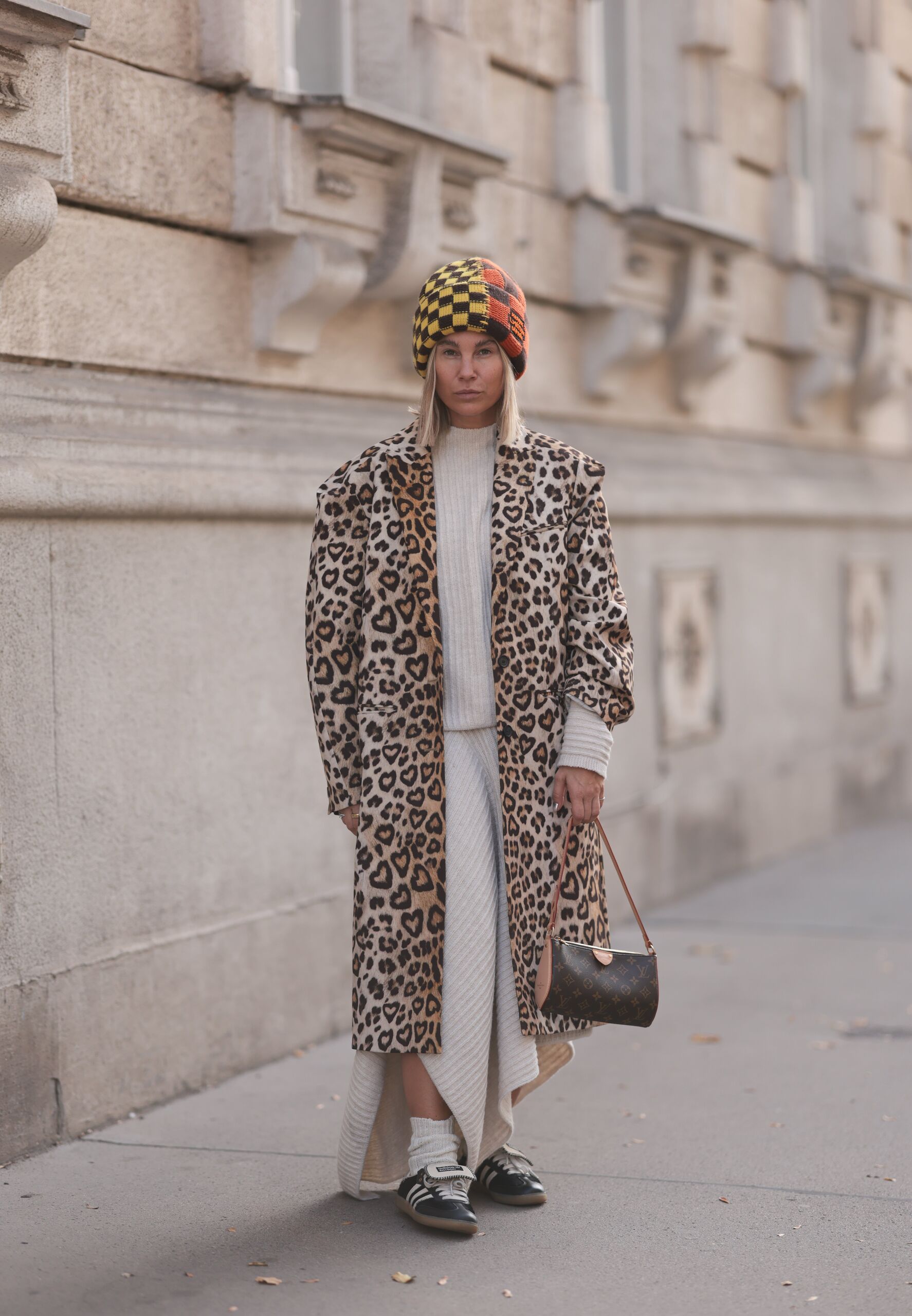A minták még játékosabbak, ha keverednek. A kockás és a leopárd feldobja a semleges alapdarabokat, például a krémszínű nadrágot és a fekete Sambát, tökéletes egyensúlyt teremtve.