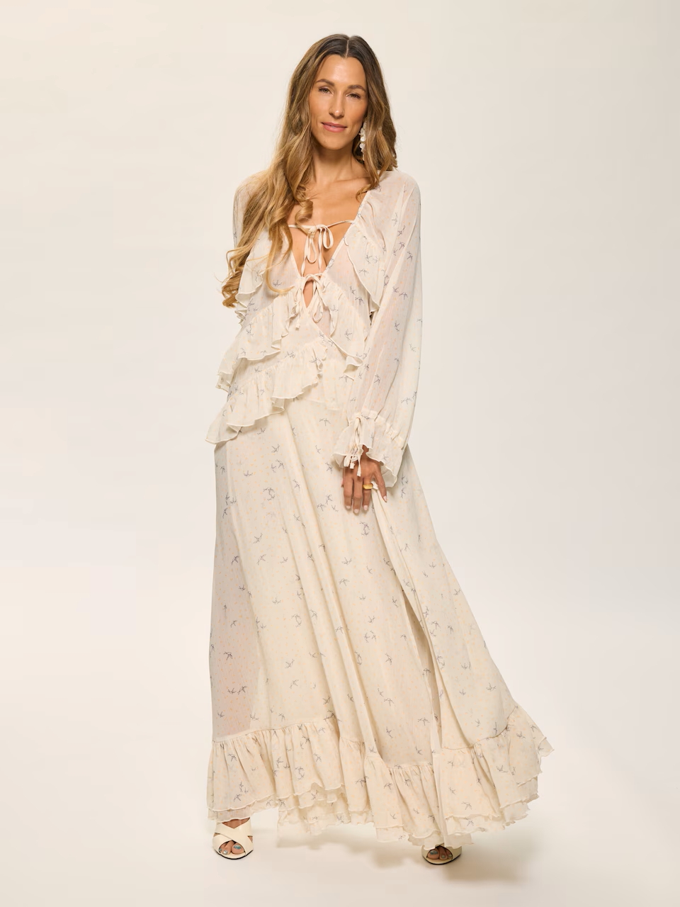 A hosszú, lebegő ruha és a térdig érő velúr csizma izgalmas kontrasztot alkot. A lágy, nőies anyagokat a csizma erőteljesebb karaktere egyensúlyozza ki, így az összhatás egyszerre romantikus és határozott. Ha itthon is elérhető darabra vágyunk, a Zara kollekciójában találunk hasonló ruhadarabot, míg velúrcsizma a CCC kínálatában elérhető.