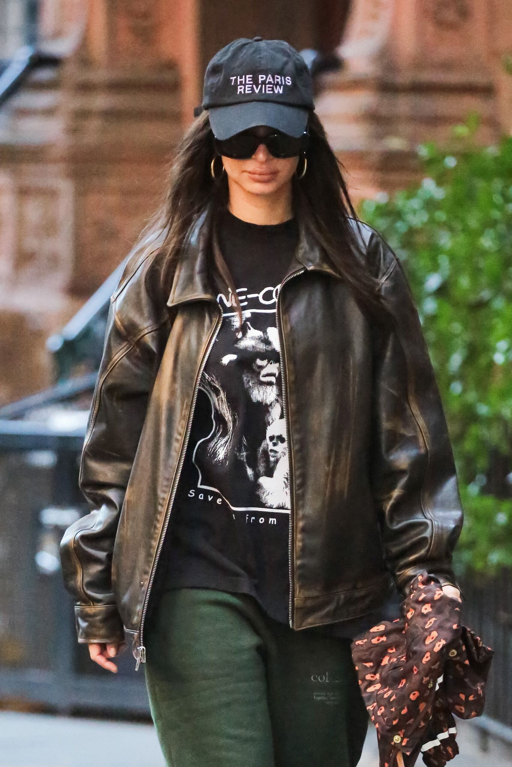 Pár napja New Yorkban a street style profi Emily Ratajkowski egy túlméretezett bőrdzsekit választott Online Ceramics pólójához, a Helfrich Collective erdőzöld melegítőjével és a Loewe Cloudtilt edzőcipőjével párosítva ezeket. Sötétbarna kabátja kopottas, vintage, ideális választás az ultra könnyed vibráláshoz.