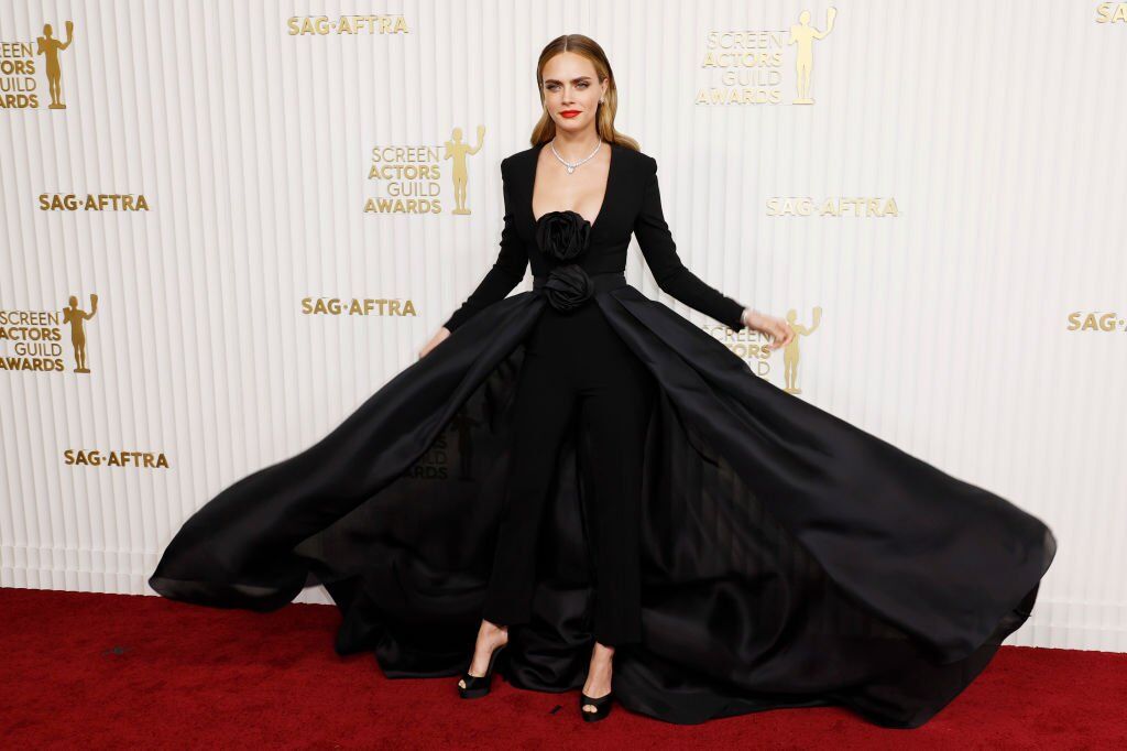 A modell ikon a SAG-díjátadóra egy fekete nadrágkosztümöt választott egy fekete, virágos részletekkel díszített köpenyes kabáttal. A modell fekete tűsarkúval, vörös ajkakkal és gyémánt nyaklánccal párosította a megjelenést.