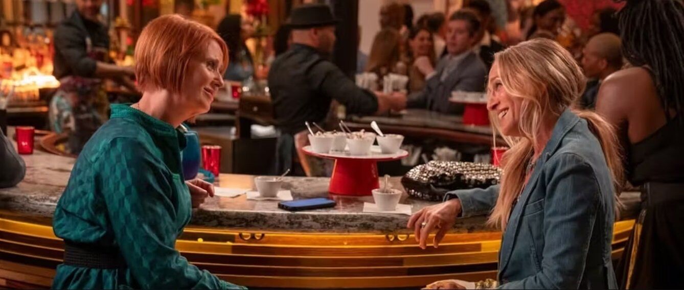 Bár Miranda is megkapta a maga mintáját, az ő ruhája kevésbé merész. Az egyik új fotón a bárpultnál ül Carrie-vel, egy kék-zöld, gyémántmintás, széles fekete övvel összefogott ruhában. Carrie meglepően visszafogottan néz ki mellette: egy egyszerű farmerblézert visel egy statement nyaklánccal. Persze azt nem lehet tudni, mi van a kabátja alatt. Carrie-t ismerve, valami vad dolog lehet, ami valahogy mégis működik.