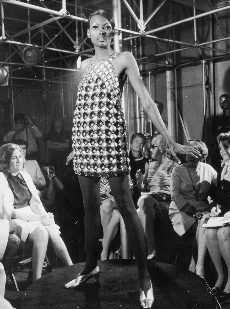Paco Rabanne 1968-ban egy lakkozott alumíniumkorongokból készült ruhát mutat be a kifutón.