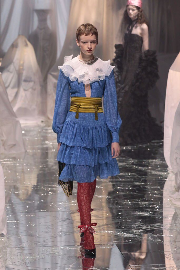 De több piros lábat láttunk a Versace-nál is, ahol Gigi Hadid egy aszimmetrikus ruhában lépett a kifutóra, amelyet sötétebb tónusú, áttetszőbb harisnyával párosított. A GDCS ugyanezt tette egy teljesen fekete összeállítással, míg Alessandro Michele a Valentino kifutón való debütálásakor több piros csipkés harisnyanadrágot is párosított a barokk ruhákhoz.