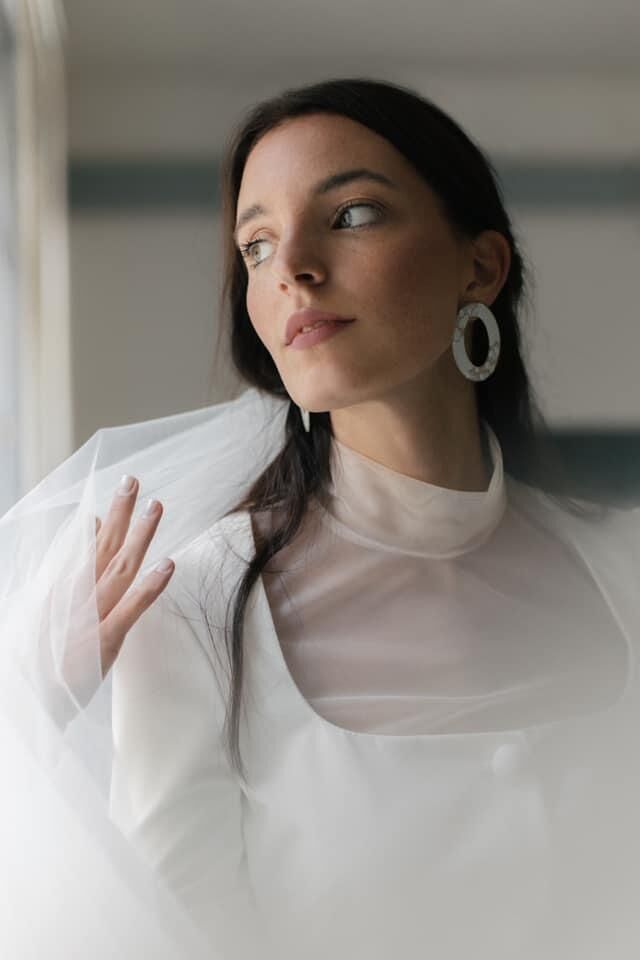 A Lucidité x Héria Enamel a modern menyasszonyoknak készült, legszembetűnőbb darabja egy fehér bridal suit, azaz egy öltöny (vagy kosztüm), mely évek óta egyre népszerűbb a trendérzékeny házasulandók körében. A fotókon hosszú fátylat visel mellé a modell, mely lágyítja, ellensúlyozza a férfias vonalakat. Az egyszerű formák mellett anyaghasználatában, textúráiban a romantikus jegyek is megfigyelhetőek a többi ruhában, a hagyományos esküvői viseletként számon tartott csipke és tüll is bőven akad, csak épp a mostani ízlésre szabva. A tűzzománcékszerek levélmintázata pedig a ruhákon a kézzel varrott csipkedíszekben is visszaköszön.