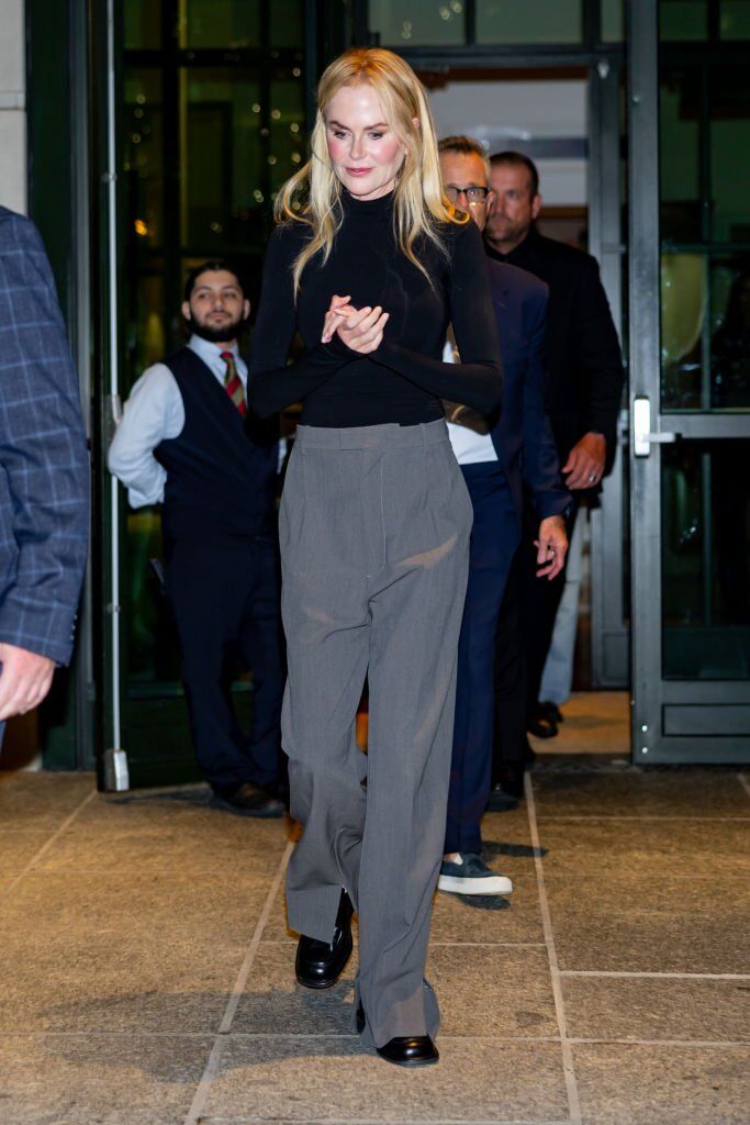 Nicole Kidman legutóbbi öltözékében három időtlen alapdarab szerepelt: egy fekete garbó, egy laza szürke öltönynadrág és egy klasszikus fekete loafer.