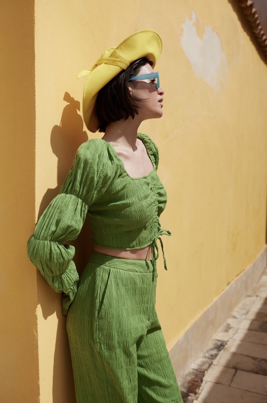 A tervezők ezúttal lecserélték a litisztult színekkel együtt az anyagok fajtáit is cserélték a különleges textúrájú anyagok javára – előtérbe kerültek tehát a jacquard, a bordás kötésű szövetek, illetve a horgolt, kézzel készült anyagok. A ruhákat fodrok és izgalmas szegélyek is díszítik. A rövidnadrágos kötött szettet keskeny, zöld színű fodorral, a rózsaszín overált pedig sárga csipkével dobják fel, utalva a szicíliai hagyományokra. A behúzható zsinórok fontos szerepet játszanak - hangsúlyozzák a derekat, zártabbá teszik a nyakkivágást vagy szabályozzák a felső hosszát. Emellett praktikus és dekoratív funkciójuk is van, a legújabb trendeknek megfelelően.
