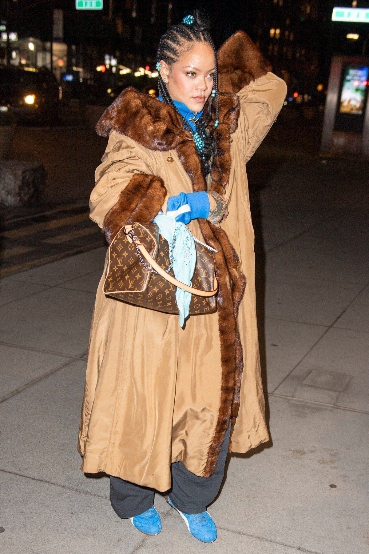 RiRit egy héten belül kétszer is kiszúrták, ahogy ezeket a feltűnő sneakereket viseli. Először egy szatén fűzővel és bőszárú farmerrel vette fel őket, mikro Louis Vuitton farmer táskával és lendületes szőrmebundával párosítva, majd nemrég egy hozzá illő kék tréningruhát és teveszínű kabátot viselt szőrmeberakásokkal és Louis Vuitton Speedy táskával.