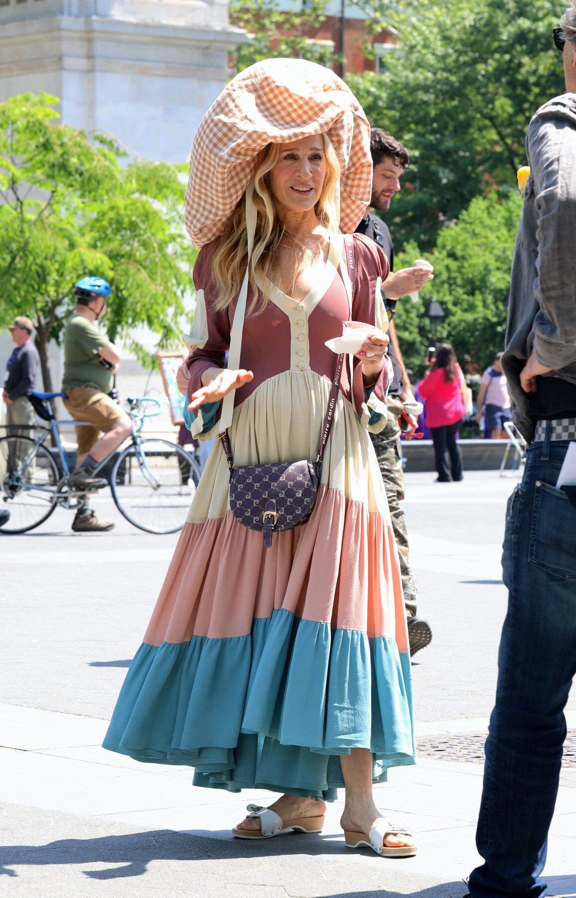 Egy funky oversized napkalappal Maryam Keyhanitól (tudjuk, hogy Carrie mennyire szereti a fejdíszeket) és egy lila Pierre Cardin crossbody táskával egészítette ki a szettet. Piknikre vagy egy sétára a parkban is megfelel, még akkor is, ha teljesen elütött Choudry elegáns együttesétől.