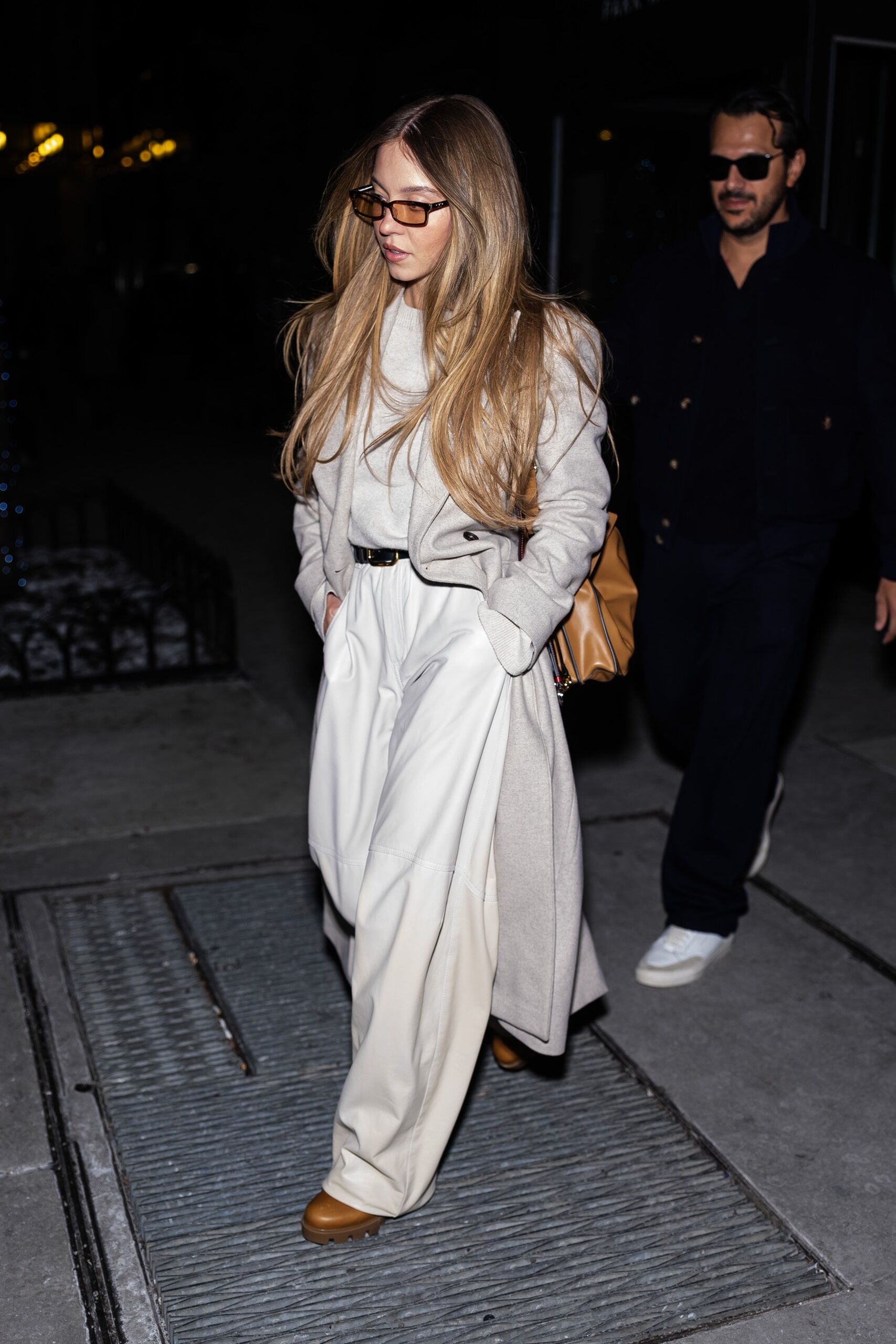 Másnap Sweeney a New Yorkban hulló hóhoz illően választott megjelenést. A sztár haja kissé lazább hullámokban hullt a vállára, és a Burberry 2024-es őszi-téli ready-to-wear kollekciójából választott egy teljesen fehér szettet.