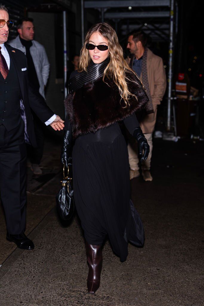 Szettje tökéletesen dacolt a város fagyos hőmérsékletével. Megjelenése egy „bőröves shearling köpenyből”, valamint egy finom buborékszoknyából, fekete bőrkesztyűből és sötétbarna csizmából állt. A választott szemüvege? Egy Gucci Lido ovális keret, amelyeknek a halántékán egy egymásba nyíló G jelzés található.