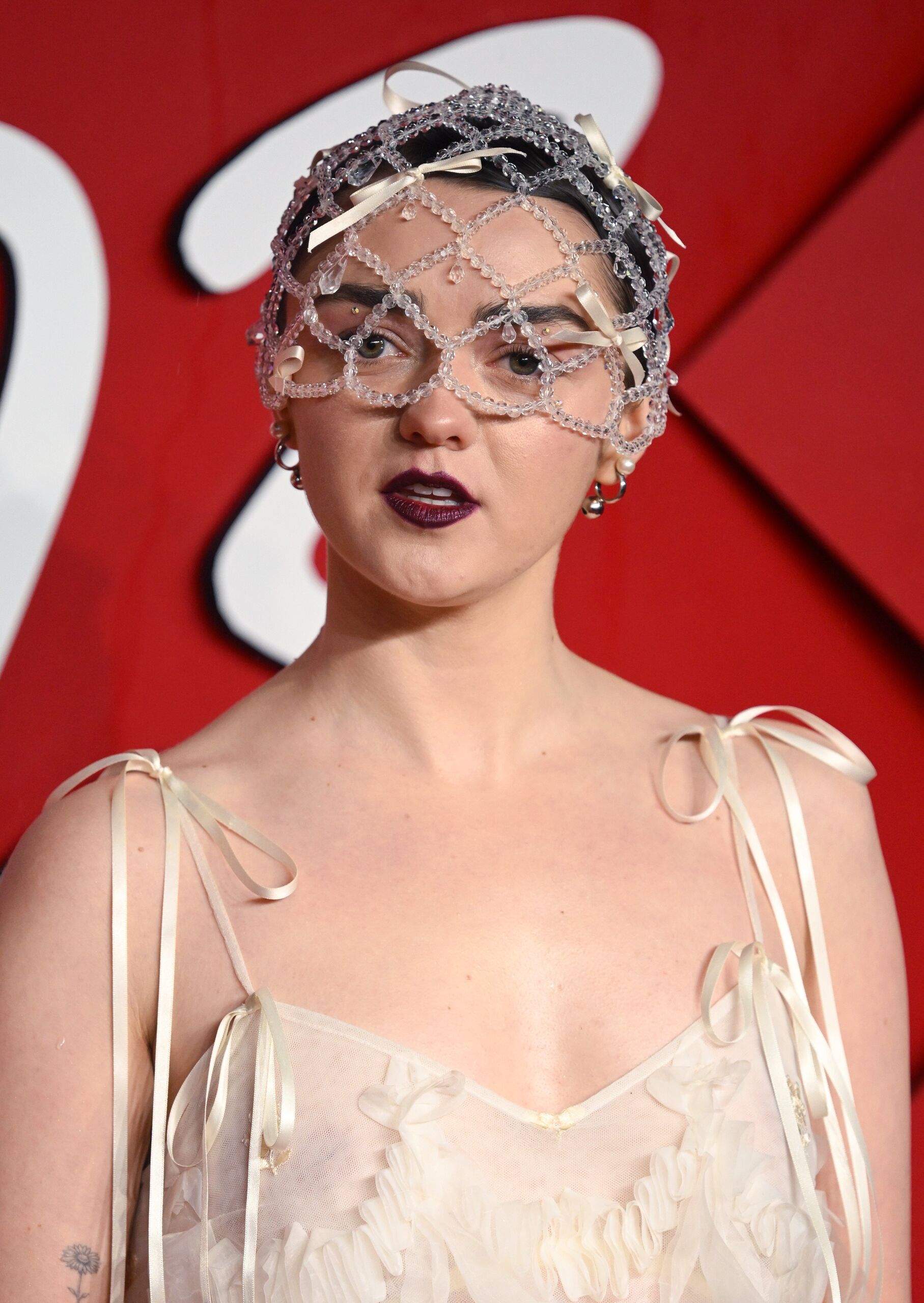 Maisie egy finom gyöngyfátyollal és mélylila ajkakkal mutatta be a kokett esztétikát.