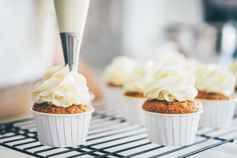 6. lépés: Készítsük el a cukormázat: elektromos keverővel verjük simára a krémsajtot, a vajat és egy nagy csipet sót egy nagy tálban, majd adjuk hozzá a porcukrot, egyszerre 1 csészével, és minden egyes hozzáadás után keverjük össze jól. Keverjük bele a vaníliát, majd a krémsajtos mázat tegyük át egy habzsákba.