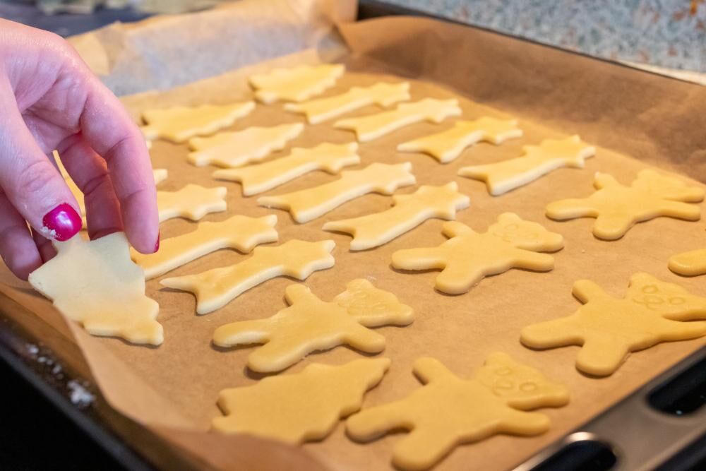 A száraz összetevőket keverjük össze, majd adjuk hozzá a mézet a vajat, a tojást, és a narancs levét. Ezt követően az egészet gyúrjuk egy gombóccá, majd tegyük a hűtőbe 1 órára és pihentessük. Ha ez megtörtént, nyújtsuk ki a tészttát, körülbelül ceruza vastagságúra, és a különféle formákkal szaggassuk ki.