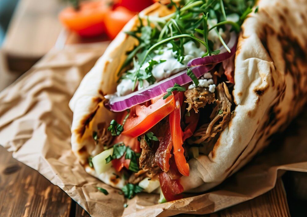 Ezután pakoljunk minden alapanyagból kedv szerint a meleg pitákba, majd tekerjük fel ezeket. Végül a tetejükre mehet a tzatziki és az extra kapor.