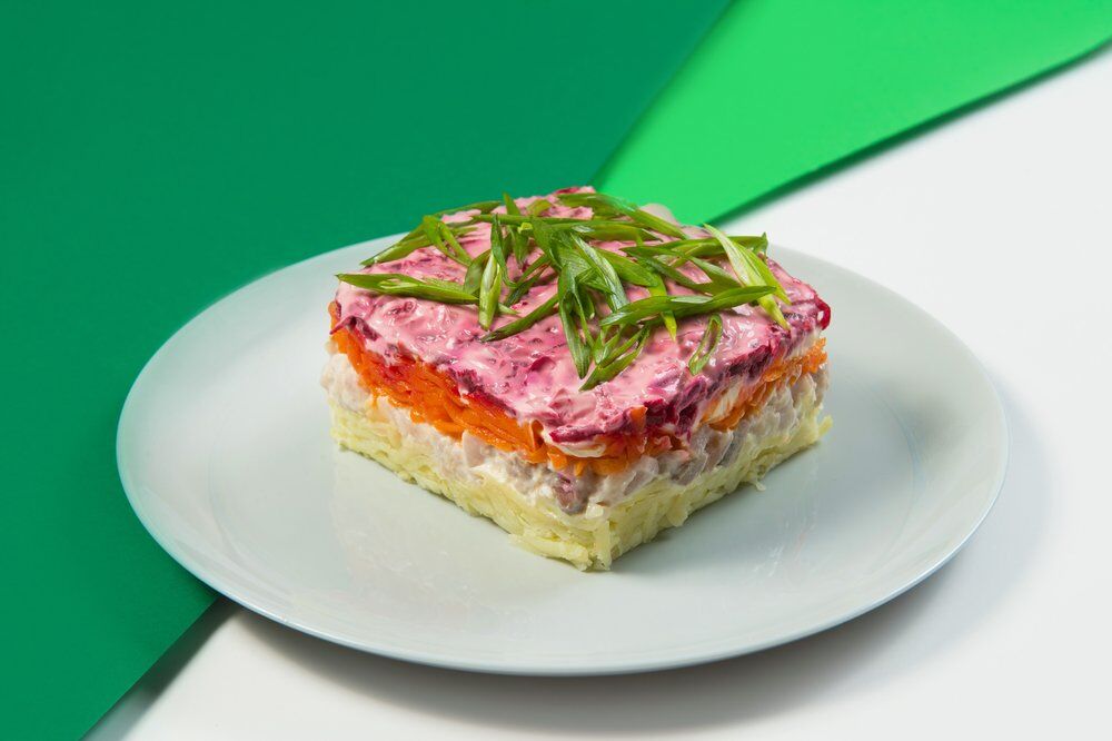 Nagyon különleges ízű, meglehet, hogy pont emiatt megosztó étel. Annak, aki szereti az izgalmas ízeket, a sós halakat, annak biztosan kedvence lesz. Mindkét cirill betűs náció szeret sokféle előételt fogyasztani, vendéglátáskor mindig bőven kínálják, de egyszerű hétköznapokon egy-egy ilyen kiadósabb előétel akár vacsoraként is szolgálhat. Külön-külön megfőzzük a céklát, a sárgarépát, krumplit, és a tojást. A megfőtt zöldségeket hagyjuk kihűlni és mikor már nem fenyegetnek harmadfokú égési sérüléssel, megpucoljuk, majd nagy lyukú reszelőn, külön-külön lereszeljük. A vöröshagymát finom karikákra, a sós heringet nagyon apró csíkokra, a főtt tojást pedig pöttöm kockákra, szinte törmelékké vágjuk. A majonézt, ami naná, hogy sokkal finomabb, ha házilag készítjük, alaposan kikeverjük tejföllel. Az előkészített alapanyagokból dombocskát építünk: egy nagyobb, szép lapos tányéron alulra kerül a reszelt krumpli körülbelül egy centi vastag rétegben, erre simítunk egy vékonyabb, kisebb kerületű réteget az apróra vágott sós heringből, majd majonézt kenünk rá, arra megint kisebb kerületű reszelt cékla réteget borítunk, amit újfent egy réteg majonéz követ, majd a reszelt sárgarépa sorát rendezzük el. Végül meghintjük az apró kockákra vágott főtt tojással, amit külső rétegként végezetül megkenünk a megspórolt maradék majonézzel. De persze mást is készíthetünk, nem muszáj kerek dombot építőkockáznunk a hozzávalókból. Néhány órára hűtőbe tesszük, ahol a hideg bevégzi az állagát érintő utolsó szösszeneteket, majd tortacikkekre vágva kínáljuk, hogy láthatóvá váljanak a különböző színű, impozáns rétegek. Az íze fergeteges, a külseje elképesztően mutatós, igazi biztos befutó, ha kápráztatni szeretnénk.