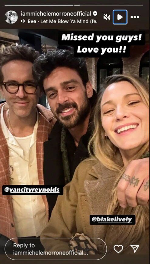 Morrone az Államokban leginkább a 365 nap című, gőzölgő Netflix-filmben való szerepléséről ismert. Az olasz színész január 26-án, vasárnap posztolt egy szelfit Livelyval és Reynoldsszal, és azt írta: „Hiányoztatok, srácok! Szeretlek titeket!!!”.