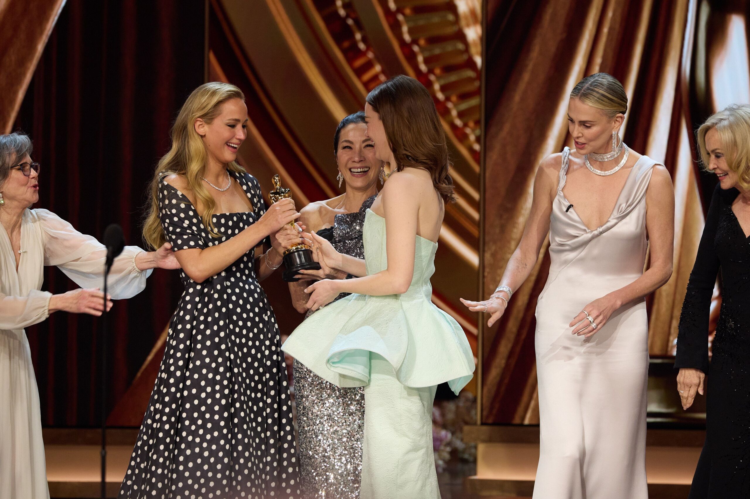 Amikor Stone a színpadra érkezett, hogy átvegye trófeáját, Yeoh először Jennifer Lawrence-nek nyújtotta át a díjat, aki aztán átadta azt a zavart Stone-nak. A kínosnak tűnő interakció jó pár néző figyelmét felkeltette, de Yeoh azóta az Instagramon tisztázta, mi is történt valójában.