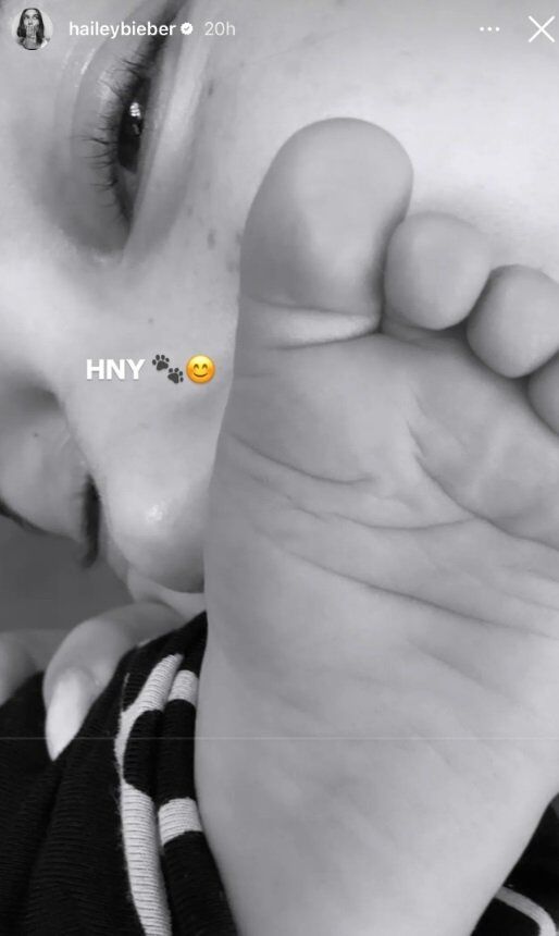 Az újévi fotón csak Jack lába látható, a háttérben pedig a büszke anyuka, Hailey mosolyog.
