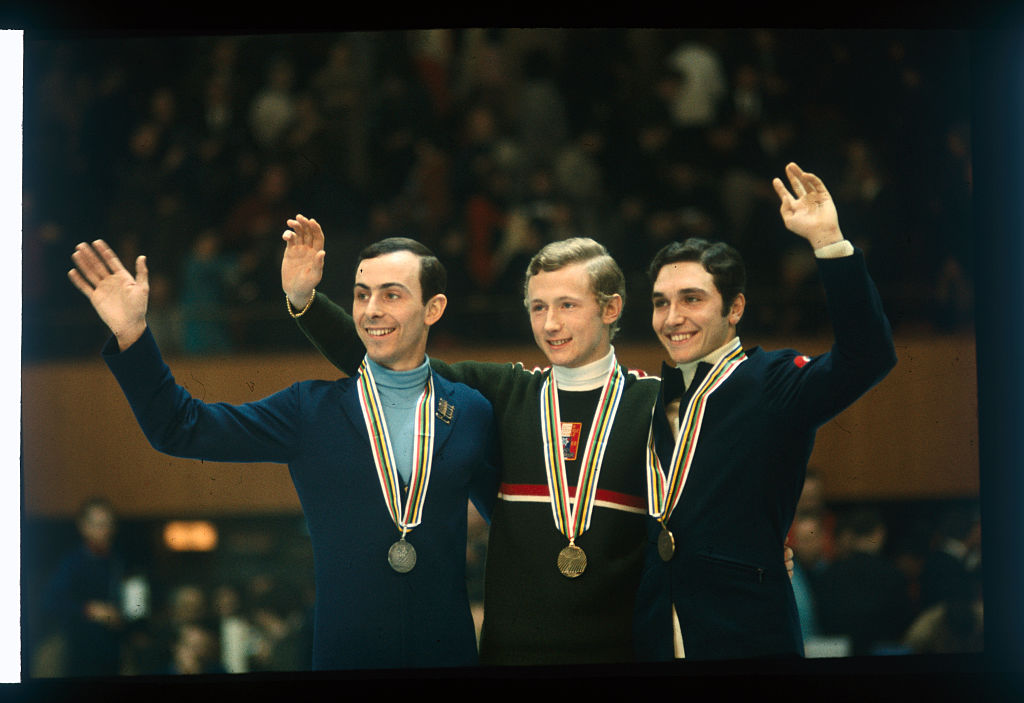 Emmerich Danzer aranyérmes műkorcsolyázó a dobogó tetején áll, mellette Tim Wood és Patrick Pera. Ez volt az első téli olimpia, amelyet színes televíziós közvetítésben láthatott a világ.
