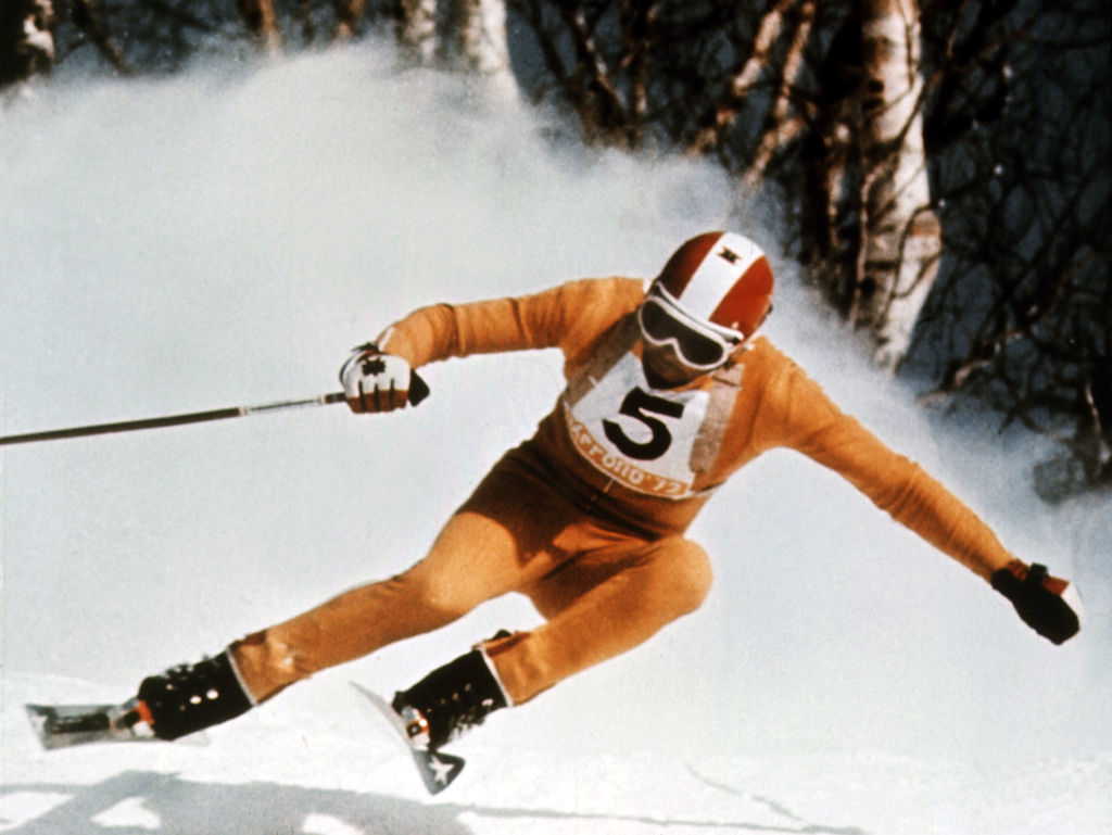 Heini Messner osztrák alpesi síző ereszkedik lefelé – ez volt az első alkalom, hogy Ázsia adott otthont az olimpiai játékoknak.