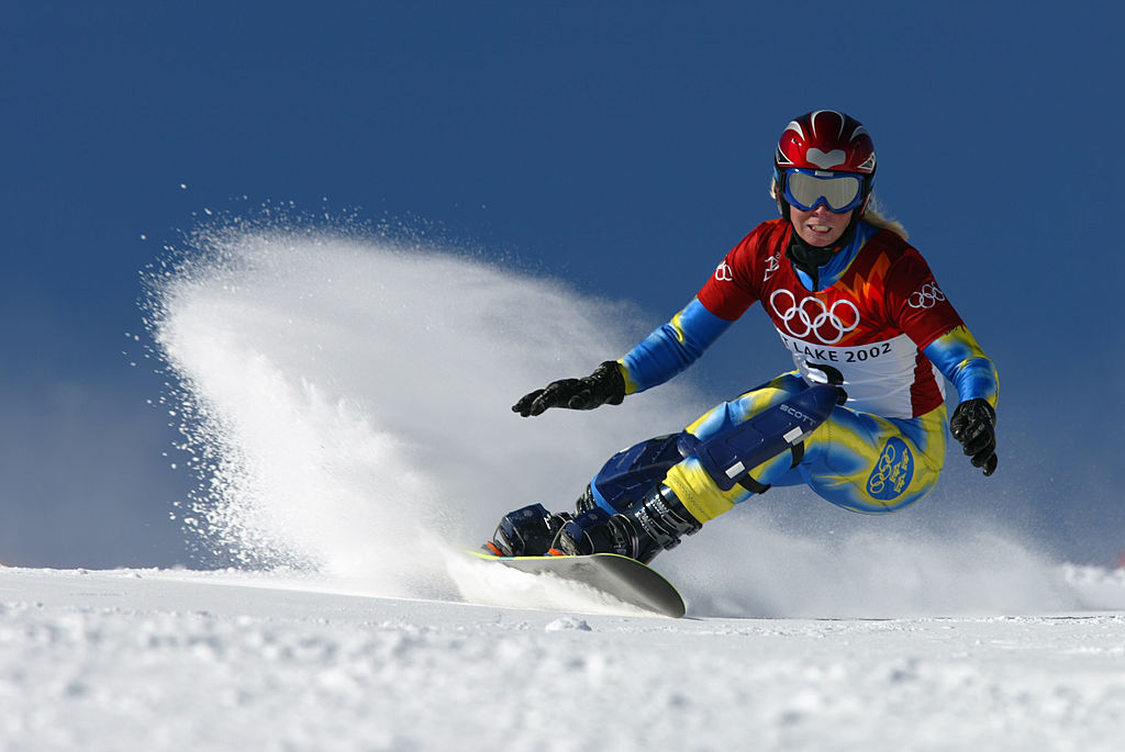 Karine Ruby francia snowboardos a női parallel óriás-műlesiklás döntőjében. A snowboard ekkorra már végleg a téli olimpia részévé vált.