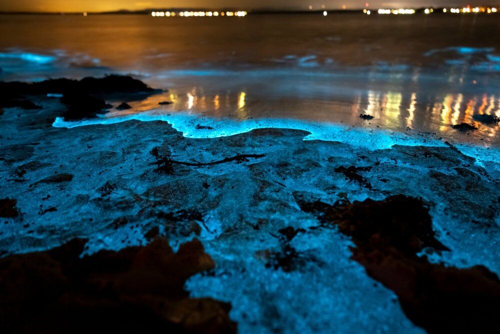 Az Indiai-óceán csillogó kiterjedése a sötétben kéken ragyog, és olyan látványt nyújt, mintha a csillagok a víz alá merültek volna, miután leestek az égből. A part mentén még több apró csillagszerű pöttyöt sodornak fel a hullámok, és hullanak a partra, megvilágítva a nedves homokot, mintha az éjszakai égbolt tükröződései lennének.