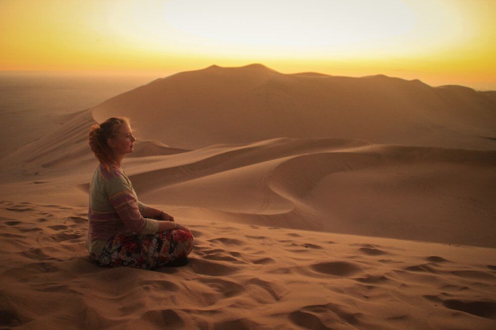 egy nő törökülésben ül a Namib-sivatagban